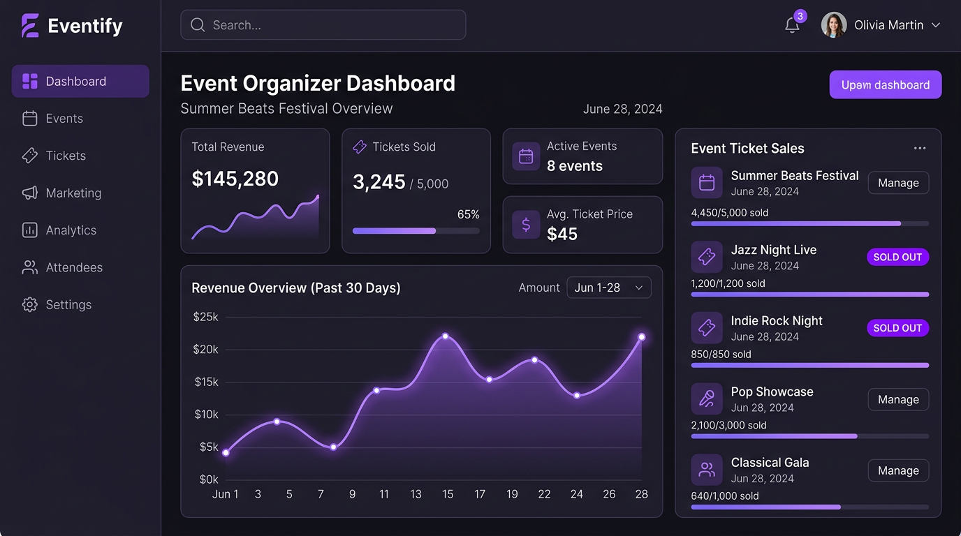 | Organizer tools | Dashboards, affiliates, analytics | Event management |